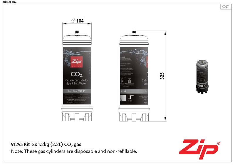 Easily replace the sparkling canisters in your Zip HydroTap or Zip Chilltap. The kit includes 2 Sparkling Replacement Canisters containing 1.2kg (2.2L) each. Canisters are pressurised and must be handled with care. It is recommended to change the washer, Part No. 95267, every 4 gas bottle changes.
